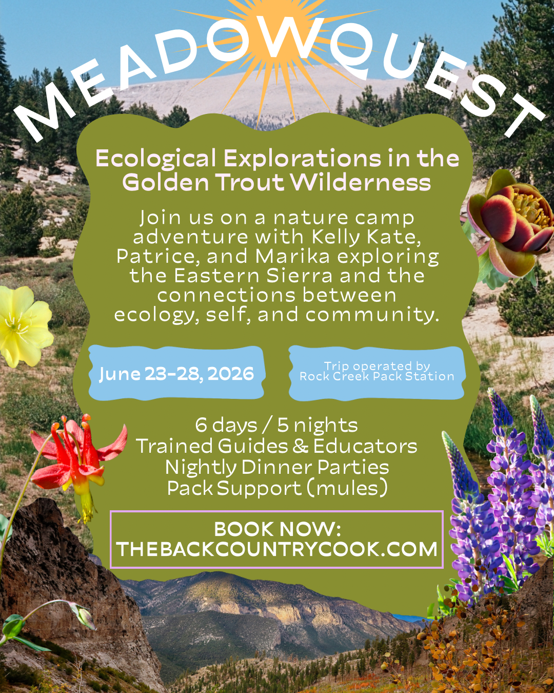 Join biologist Patrice Ringelstein and bioregional herbalist Marika Clymer for a weeklong nature camp in the Golden Trout Wilderness. We will deepen the connection to our bodies, our communities, and the land through exploration of the ecology of the Sierra Nevada. The trip will begin and end with a horseback ride into a cozy camp at the edge of Big Whitney Meadow, and we’ll spend the rest of our trip hiking, eating nourishing meals, and learning together.